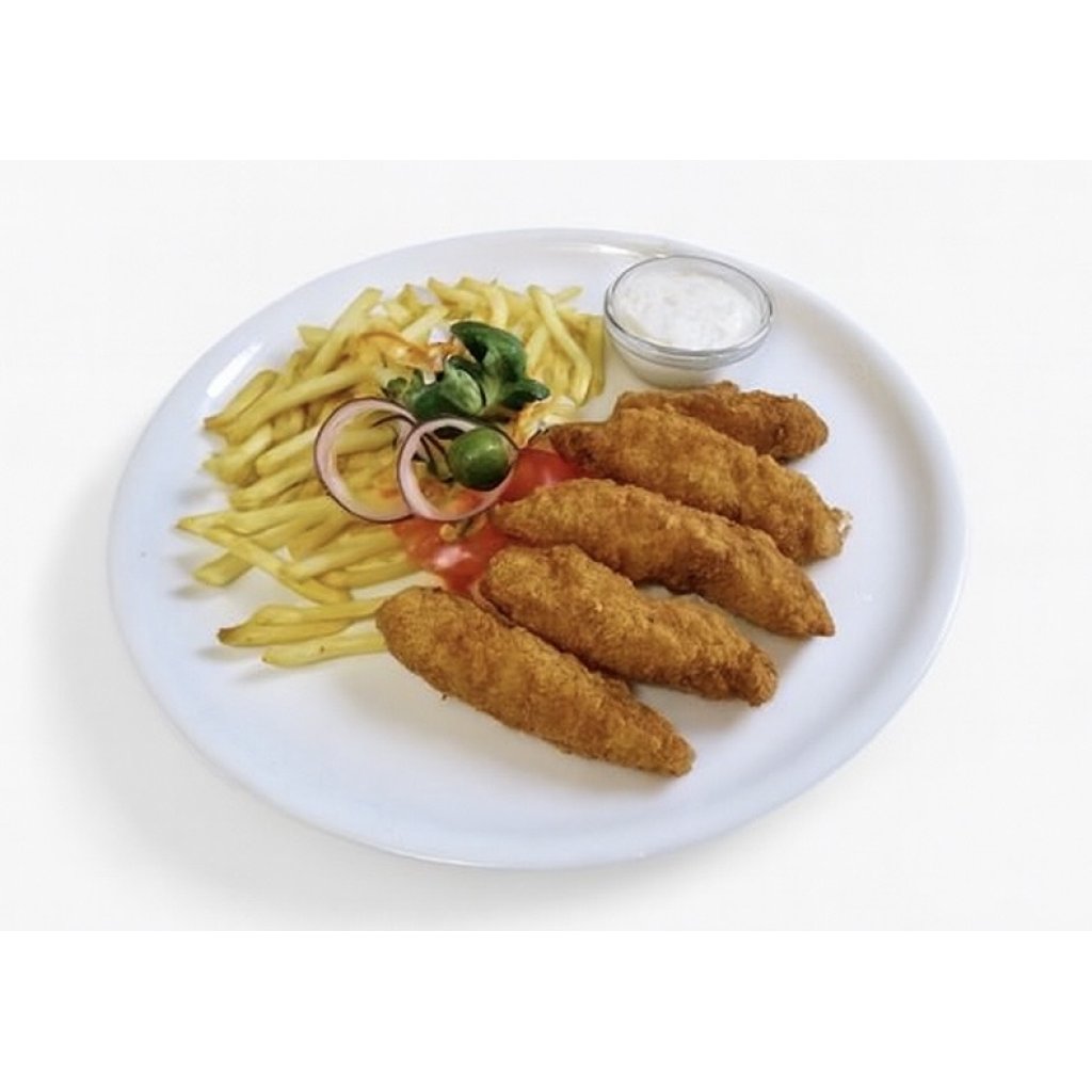 Smažené kuřecí stripsy Smažené kuřecí stripsy v křupavém trojobalu, hranolky a naše poctivá domácí tatarka