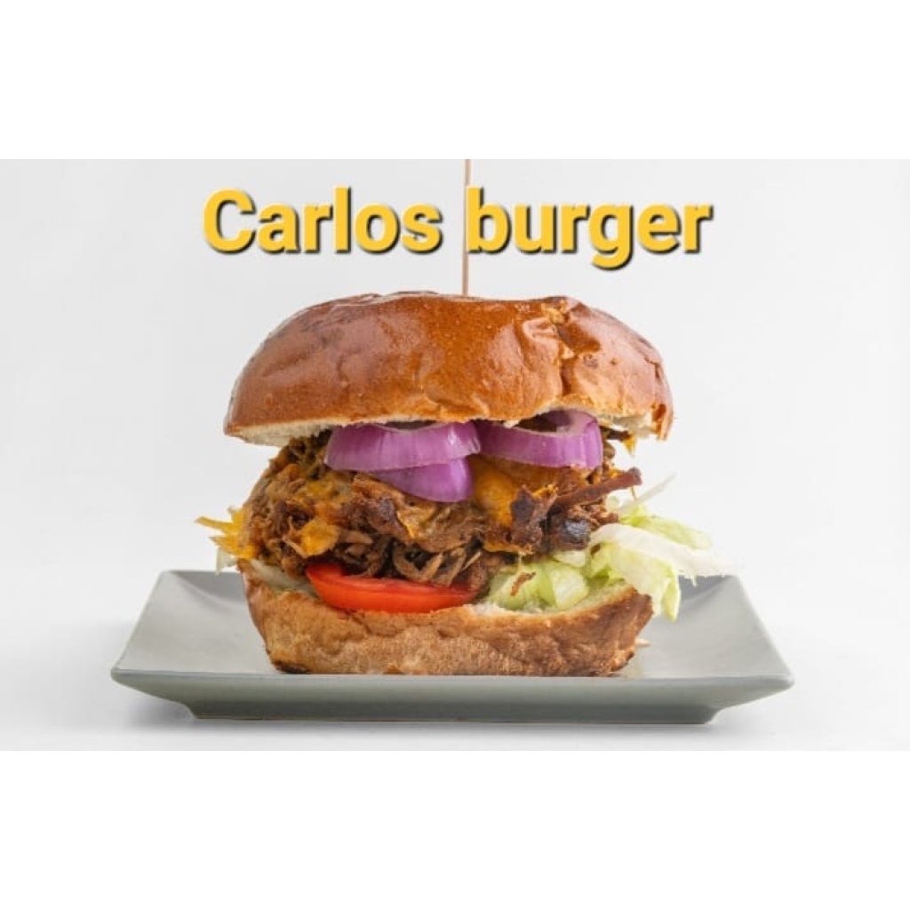 15Og trhané vepřové maso, čedar, ledový salát, ster. okurek, rajče, červená cibulka, burgerová omáčka