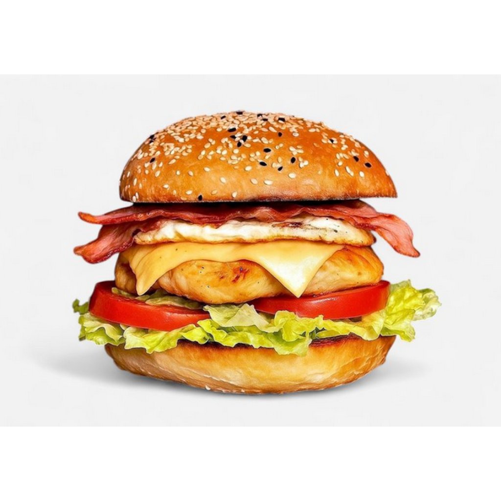 KUŘECÍ MASO, MÁSLOVÁ BULKA, ČESNEKOVÁ OMÁČKA, GOUDA, KŘUPAVÁ SLANINA, RAJČE, LEDOVÝ SALÁT