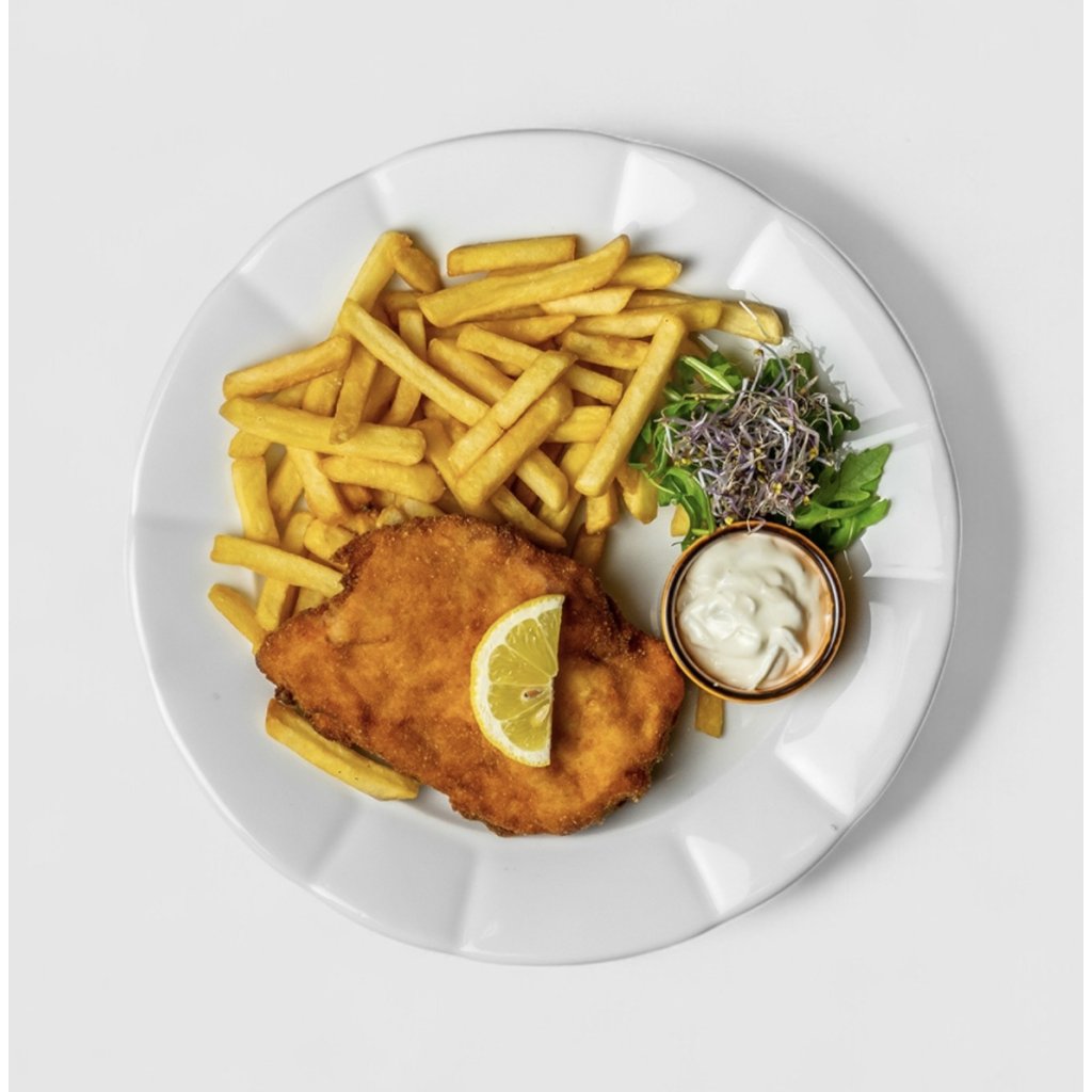 Smažený kuřecí řízek Smažený kuřecí řízek, hranolky, domácí tatarka a kečup